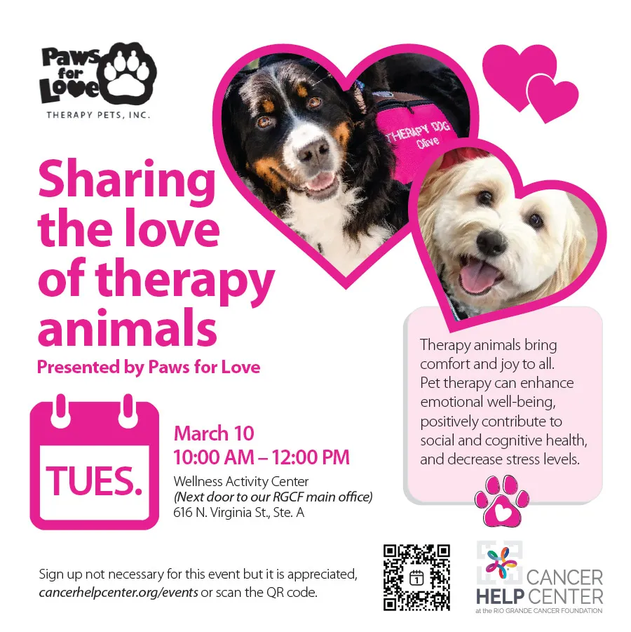 March 10, 2026 10:00 AM - 12:00 PM, share in the love of therapy animals. In our new Wellness Activity Center (next door to our office, 616 N. Virginia St., Ste. A )