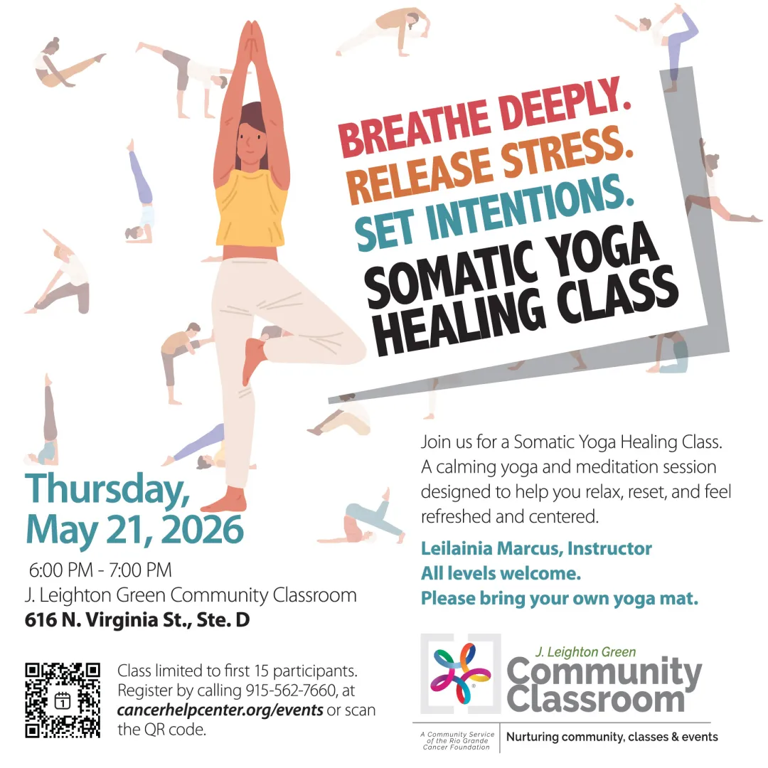 Join us for a Somatic Yoga Healing Class. A calming yoga and meditation session designed to help you relax, reset, and feel refreshed and centered. Please bring your own yoga mat.