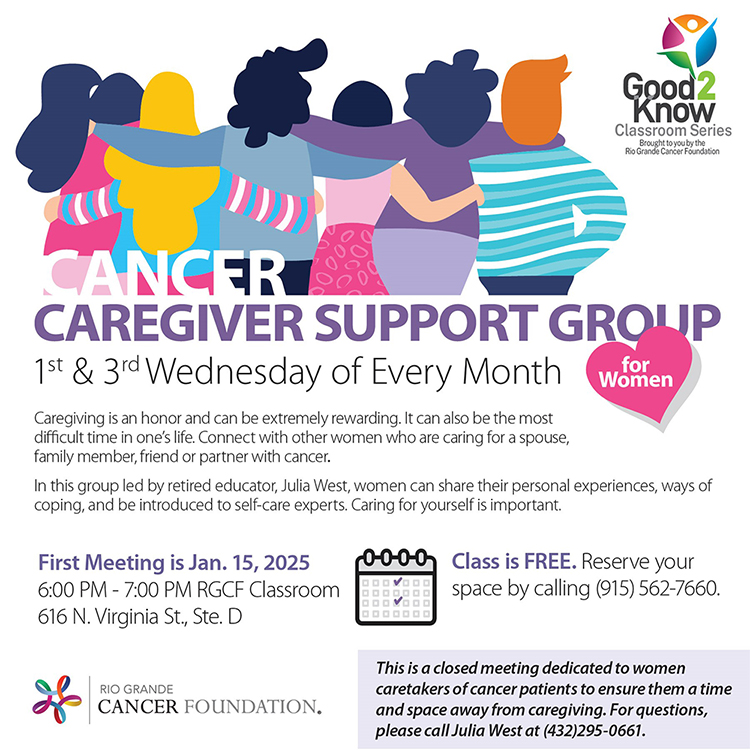 The Rio Grande Cancer Foundation is happy to announce a new support group designed specifically for women who take on the responsibilities of caring for a sick or elderly loved one. The class will meet twice on the first and third Wednesday of every month beginning in January 2025. Reserve your space by calling 915-562-7660.